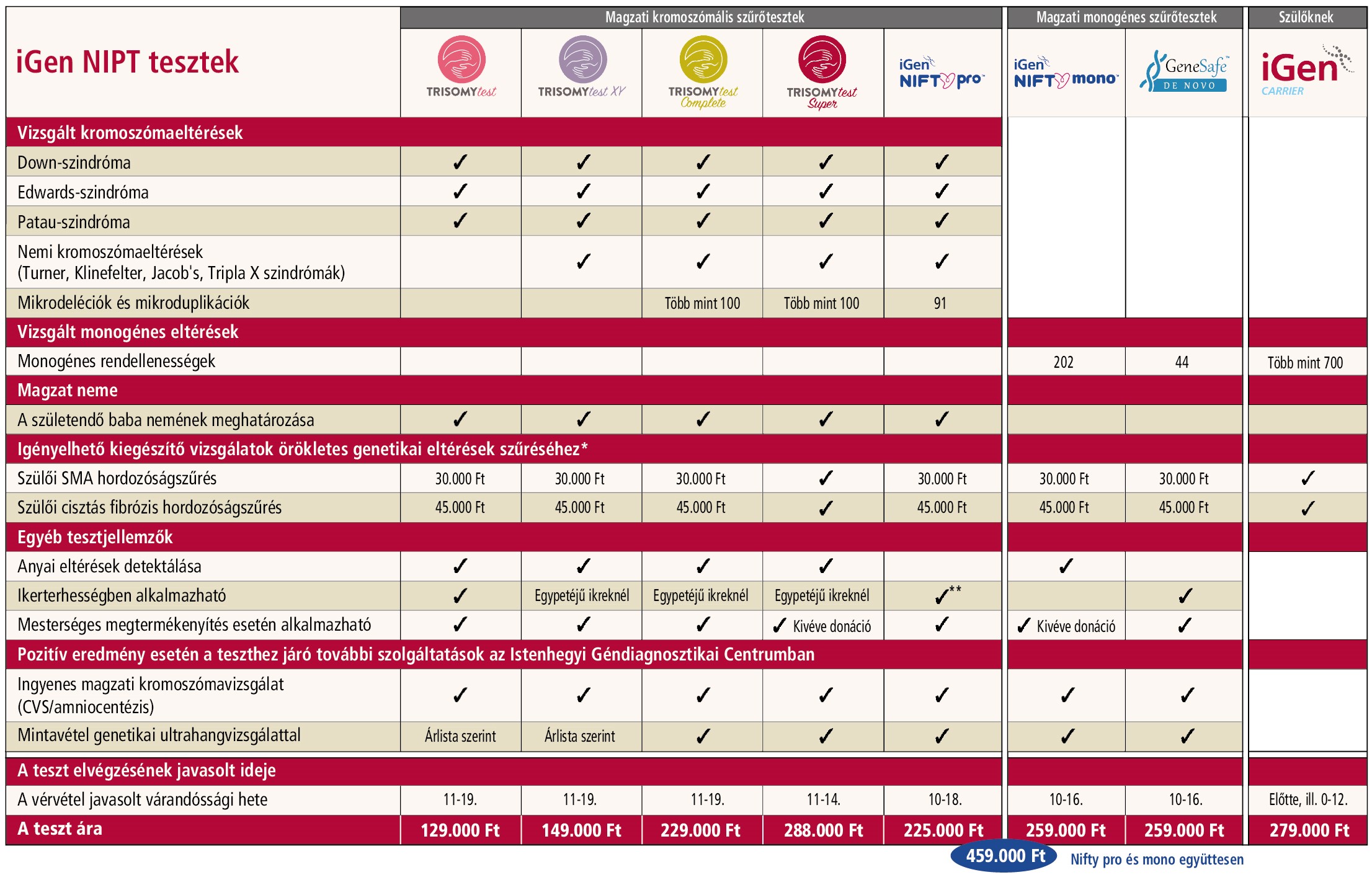 - Legszélesebb körű NIPT tesztünk, a Trisomy Teszt COMPLETE a baba minden kromoszómáját szűri. Nagy megbízhatósággal kimutatja az összes kromoszóma számbeli eltérésének és több mint 100 mikro-deléciós és duplikációs szindróma kockázatát, ára 229.000Ft.